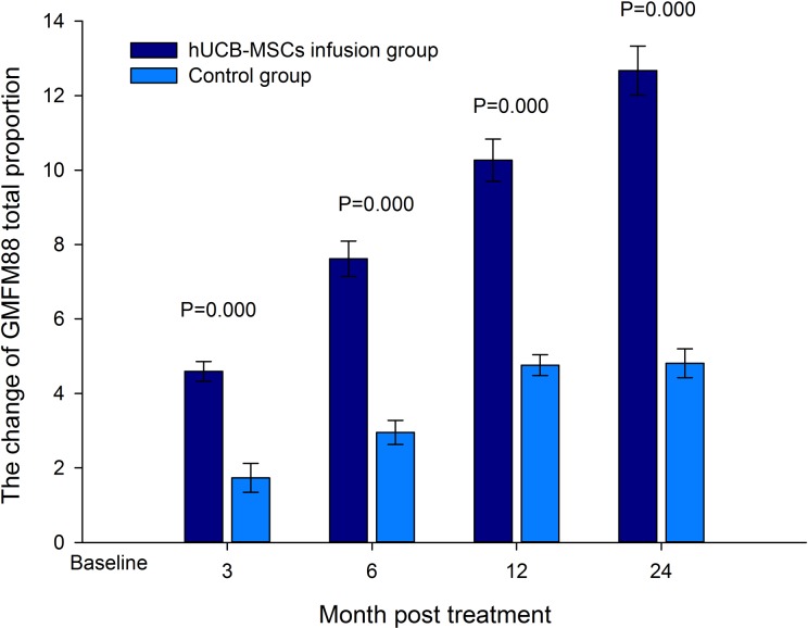 兩組之間的基線(xiàn)功能評估(包括GMFM-88量表分數和CFA分數)沒(méi)有觀(guān)察到顯著(zhù)差異。輸注hUCB-MSC后相對于基線(xiàn)狀態(tài)的改善在輸注組中顯著(zhù)高于對照組。