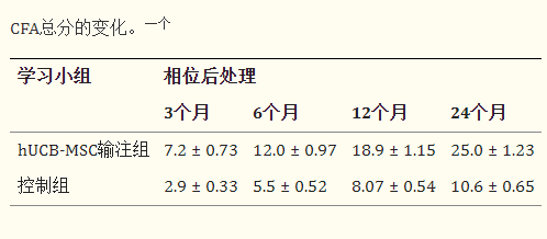 基線(xiàn)水平的CFA總分在hUCB-MSC輸注組中為66.04±1.48,在對照組中為65.70±1.37。組間未觀(guān)察到顯著(zhù)差異。CFA總分變化評估(表3)。