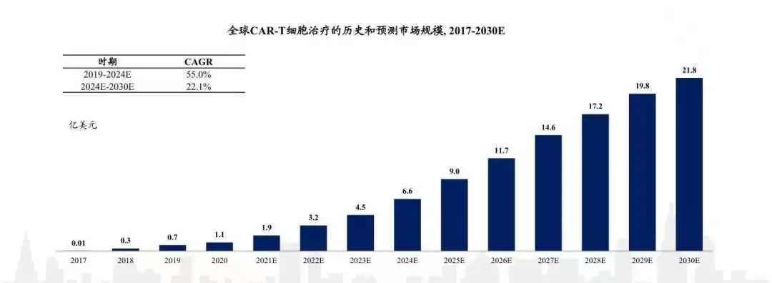 細胞與基因治療(Cell?&?Gene?Therapy,CGT)是當前生物醫藥領(lǐng)域最火熱的賽道之一,免疫細胞治療、干細胞治療、基因治療相關(guān)的進(jìn)展可謂是日新月異。CAR-T療法作為近幾年抗癌療法的寵兒,短短十余年的探索,其有效性陸續得到驗證,從臨床研發(fā)走向商業(yè)化。根據沙利文分析,預測全球在2030年CAR-T療法的市場(chǎng)規模將達到218億美元。