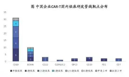 目前中國企業(yè)在國內開(kāi)展的CAR-T臨床管線(xiàn)主要集中于CD19與BCMA,也有一些公司在新靶點(diǎn)上做出突破,如科濟藥業(yè)在CLDN18.2的胃癌實(shí)體瘤中展現CAR-T療法的初步療效。