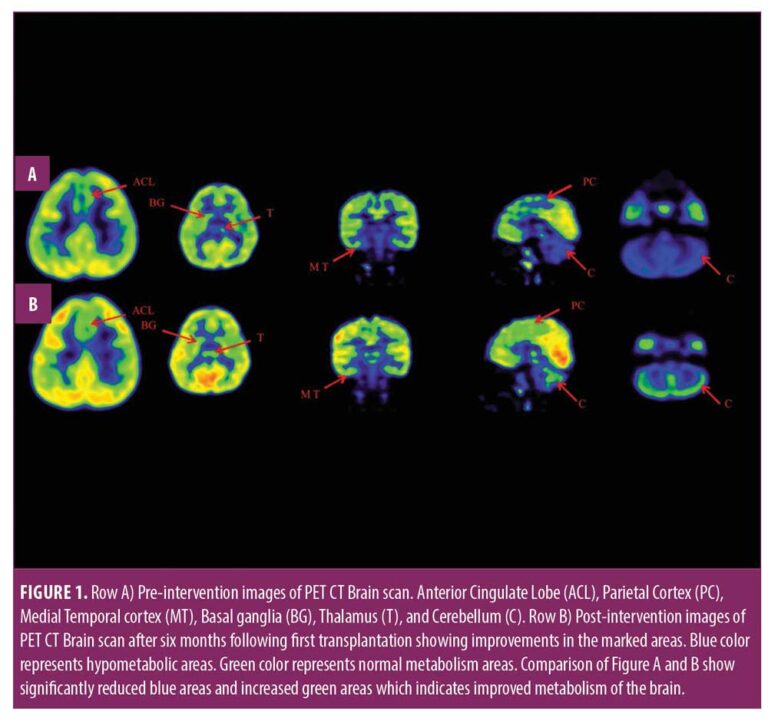 七個(gè)月后進(jìn)行了隨訪(fǎng),根據客觀(guān)量表和腦部PET CT掃描重新評估了患者干預后的臨床變化?;谒恼w改善,他接受了第二次BMMNC移植以進(jìn)一步促進(jìn)康復。鞘內施用大約5.12×108個(gè)存活率98%的BMMNC,發(fā)現CD34+細胞為0.014%。第二次移植后九個(gè)月進(jìn)行了另一次隨訪(fǎng)。