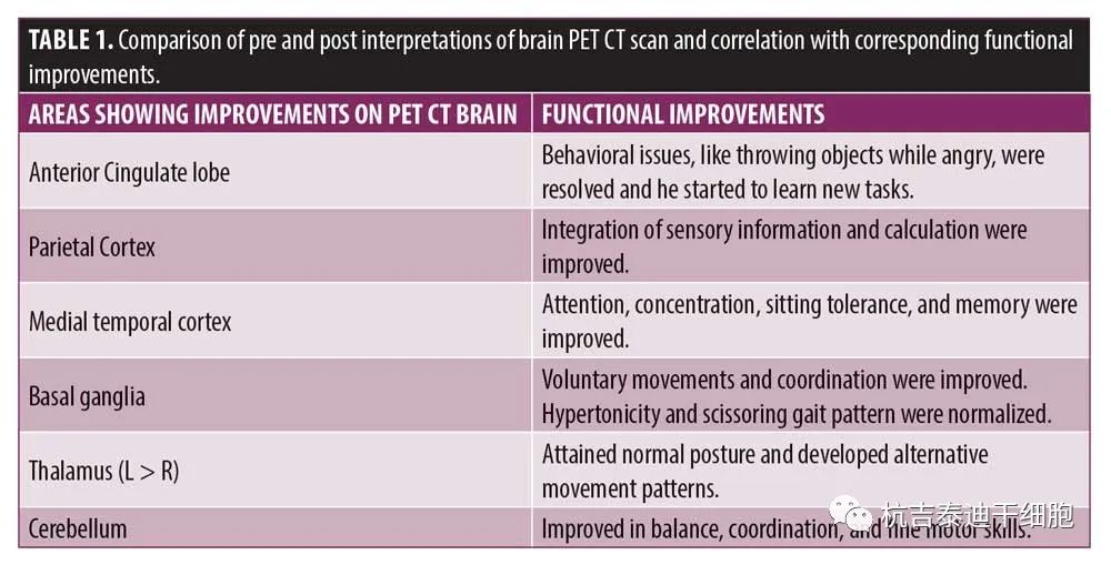 在認知上,由于他定期上學(xué),他的注意力持續時(shí)間和坐姿耐受力也得到了改善。GMFM分數從60.67提高到67。GMFCS等級由3級提升至2級;FIM評分從97分提高到99分。比較第一次細胞治療之前和之后7個(gè)月期間進(jìn)行的腦部PET CT掃描結果,發(fā)現前扣帶回葉、頂葉皮層、內側顳葉皮層、丘腦、基底神經(jīng)節和小腦(表1)。