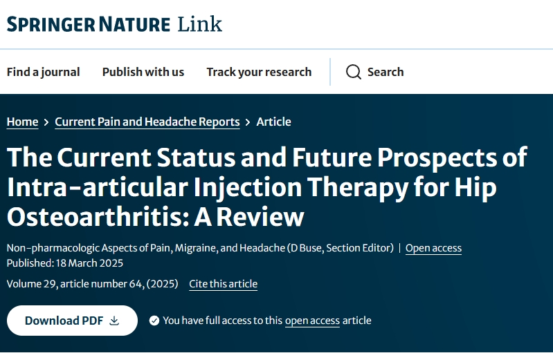 近日,國際期刊雜志《Current Pain and Headache Reports》發(fā)表了一篇“The Current Status and Future Prospects of Intra-articular Injection Therapy for Hip Osteoarthritis: A Review”的文獻綜述。