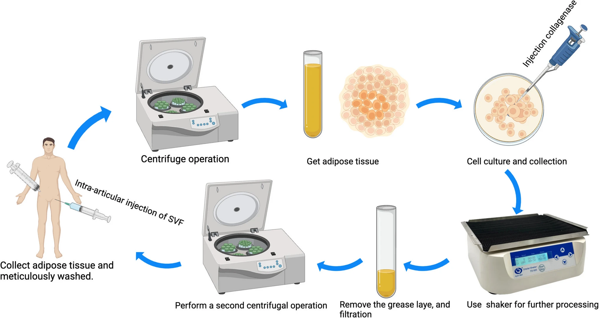 研究已明確證實(shí)了脂肪干細胞 (ADSC) 和間充質(zhì)干細胞 (MSC) 在骨關(guān)節炎 (OA) 治療中的安全性和有效性。然而,在設備齊全的實(shí)驗室中,分離、培養和增殖這些干細胞類(lèi)型通常需要數周時(shí)間,這可能會(huì )延長(cháng)患者的治療時(shí)間。自體脂肪干細胞移植 (SVF) 被認為是一種更有效的方法。此外,在應用脂肪抽吸技術(shù)的過(guò)程中,脂肪組織中的膠原酶被激活,導致脂肪水解。