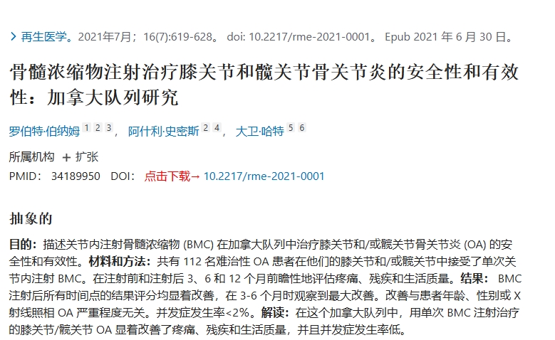 | 骨髓濃縮物注射治療膝關(guān)節和髖關(guān)節骨關(guān)節炎的安全性和有效性:加拿大隊列研究[111] | 伯納姆 | 加拿大 | 2021 | 臨床試驗 | 再生醫學(xué) | 112 | 關(guān)節內注射骨髓濃縮物 | 婦女健康與醫療服務(wù)部 (WOMAC);VAS;HHS | 6個(gè)月 |