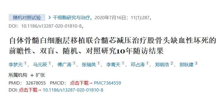 2020年,在一項為期10年的前瞻性、雙匿名、隨機對照臨床試驗中,李采用MSCs治療股骨頭壞死患者。該研究包括43名接受干細胞注射的患者,隨后進(jìn)行了十年的觀(guān)察期。研究結果表明,干細胞治療與髓芯減壓相結合比單獨減壓治療可帶來(lái)更顯著(zhù)的臨床益處。