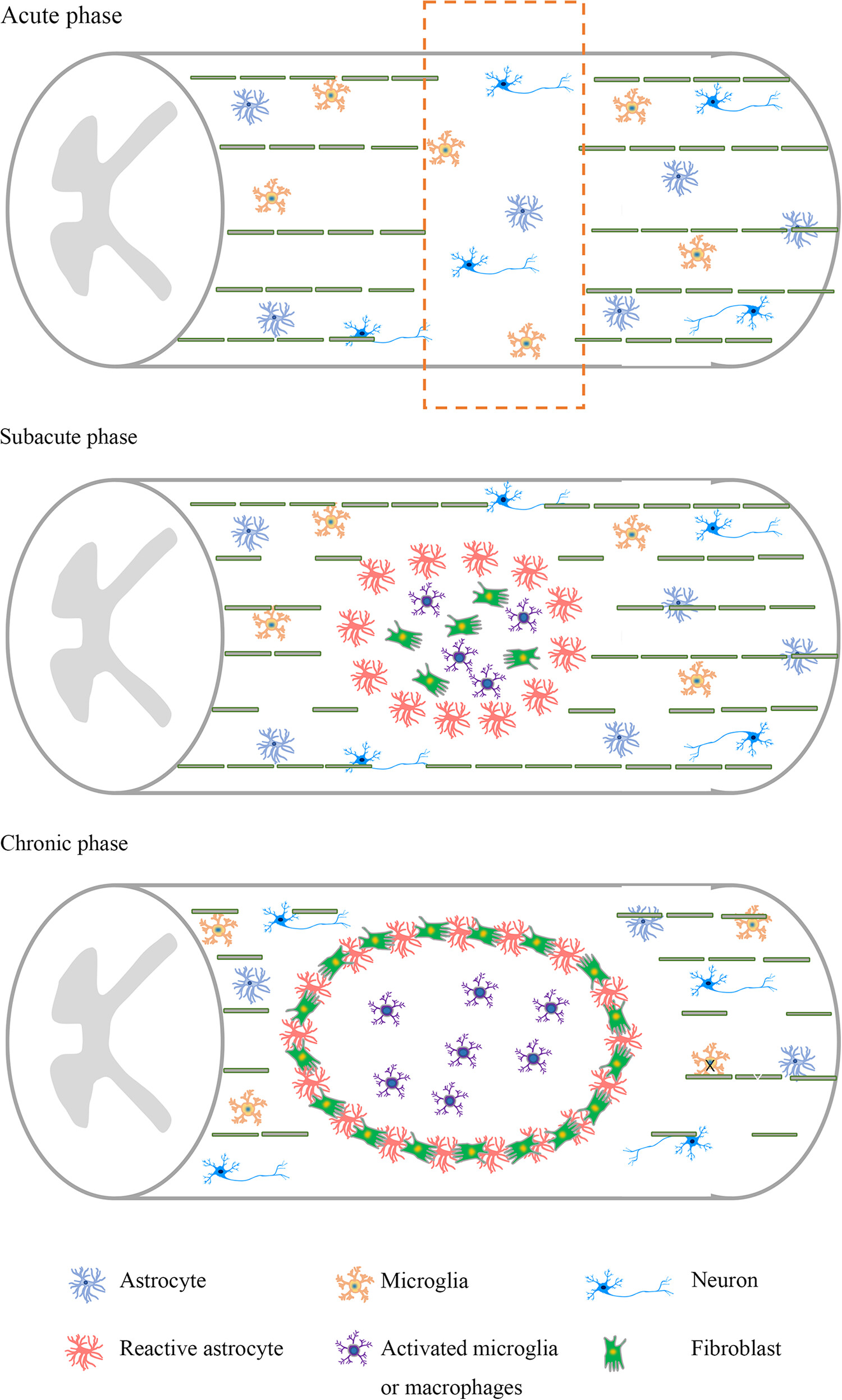 神經(jīng)元凋亡和軸突損傷在急性期很常見(jiàn)。在亞急性期,神經(jīng)元、軸突和髓磷脂大量丟失?;罨男切文z質(zhì)細胞、活化的小膠質(zhì)細胞和巨噬細胞在損傷部位聚集。慢性期進(jìn)一步形成膠質(zhì)瘢痕和損傷腔,形成抑制性微環(huán)境。