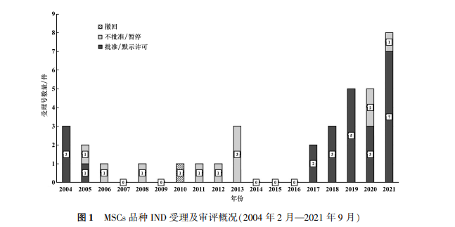 除特別審批品種以外,2004年2月—2020年12月,國家藥品監督管理局藥品審評中心受理MSCs產(chǎn)品的注冊申請有36件(以受理號計),共計27個(gè)品種[1],均為新藥(investigational new drug application,IND) 臨床試驗的申請,目前尚無(wú)干細胞產(chǎn)品批準上市。 MSCs品種在各個(gè)年份的申請數量及審評結局見(jiàn)圖1。雖然近10余年,我國的干細胞臨床研究數量總體是穩步增加的[2],但按照藥品申報的MSCs品種的數量受?chē)翌C布的細胞治療相關(guān)政策法規和技術(shù)發(fā)展的影響,呈現波動(dòng)式增長(cháng)。