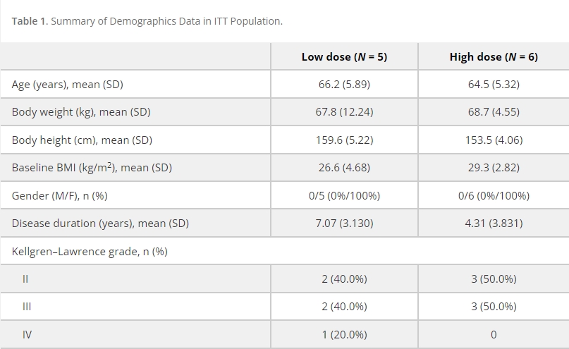 ITT人群的人口統計和基線(xiàn)特征如表1所示。在ITT人群中,低劑量組中所有受試者的平均 (SD) 年齡為66.2 (5.89) 歲,高劑量組中為64.5 (5.32) 歲。所有受試者的體重指數 (BMI) <35kg/m2,低劑量組中所有受試者的平均 (SD) BMI為26.6 (4.68) kg/m2,高劑量組中為29.3 (2.82)隊列。在這兩個(gè)隊列中,受試者均為膝關(guān)節骨關(guān)節炎II級至IV級的女性。自診斷以來(lái)膝關(guān)節OA的平均持續時(shí)間在低劑量組中為7.07 年,在高劑量組中為4.31年。