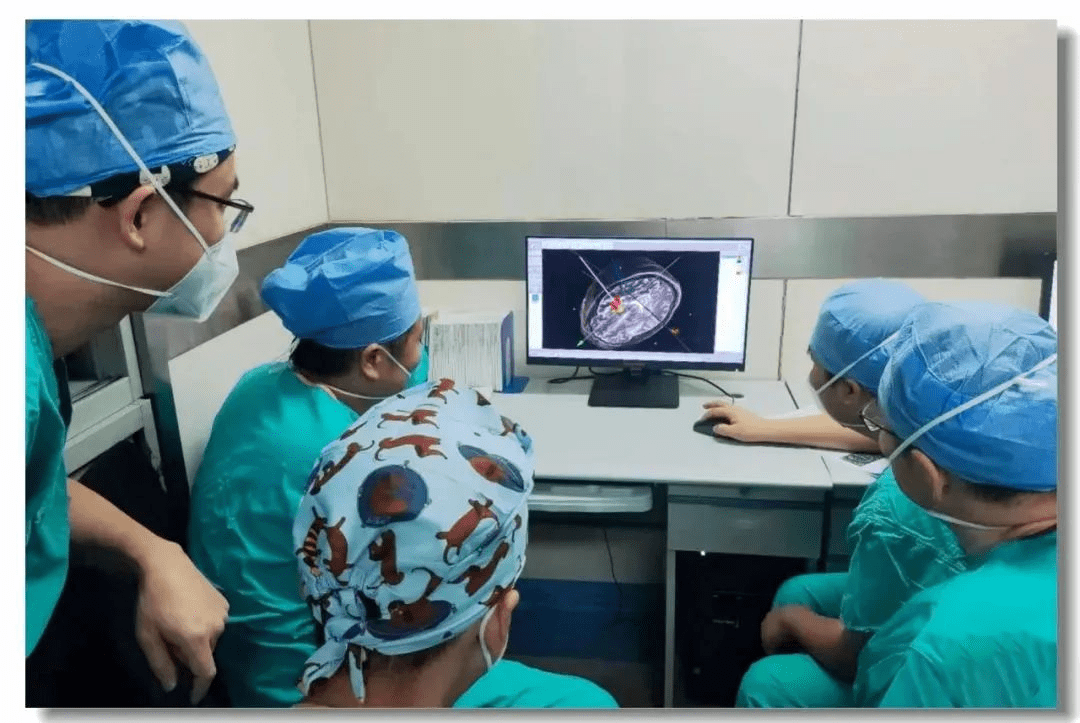 手術(shù)當日,多科室團隊協(xié)同合作以確保各步驟精確執行。孫君昭主任和董超主治醫師負責固定患者頭架,劉建國主任與韓曉琛主治醫師全程監測患者腦功能。