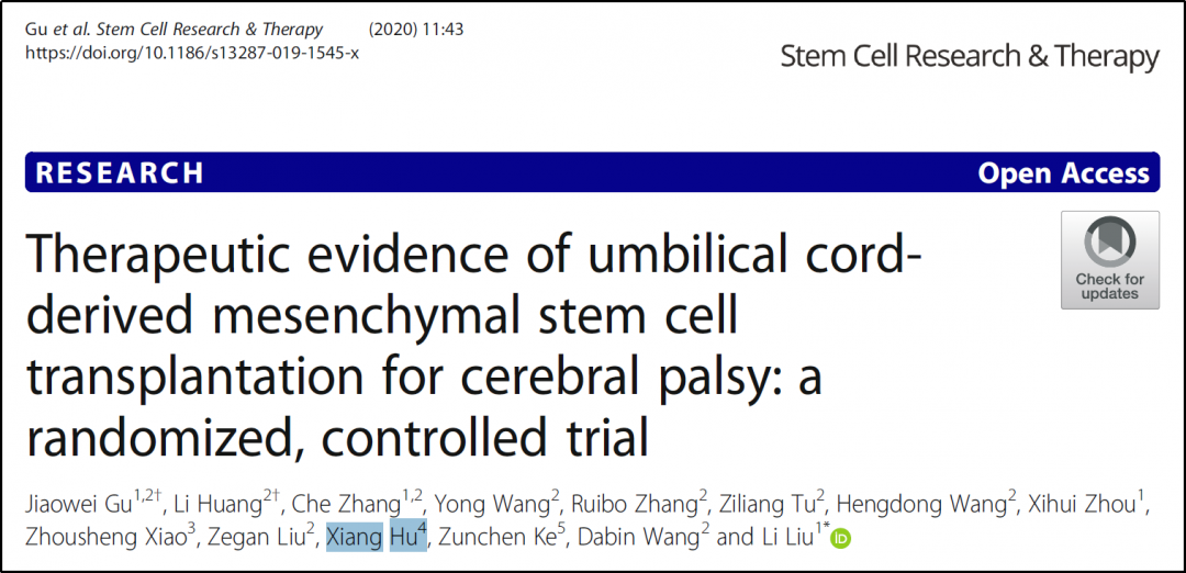 40例符合條件的患者隨機分為hUC-MSC(人臍帶間充質(zhì)干細胞)治療組和對照組。除康復治療,hUC-MSC組接受4次靜脈輸注hUC-MSCs,對照組則接受安慰劑。通過(guò)12個(gè)月的隨訪(fǎng)進(jìn)行安全性評估(通過(guò)不良事件(AEs) )和有效性評估(通過(guò)日常生活活動(dòng)能力(ADL)量表、綜合健康功能評估(CFA)和粗大運動(dòng)功能評估量表(GMFM) )。