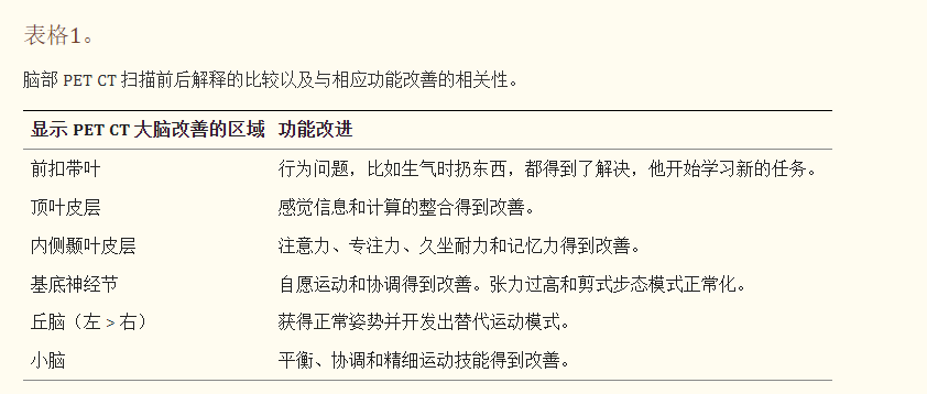 與之前的情況相比,他在矢狀面和額狀面上的體重變化有所改善;頭部、軀干和骨盆的排列也得到改善,雙側腿筋和小腿肌肉的緊繃感也有所減輕?;颊唛_(kāi)始執行雙手任務(wù)。在認知方面,由于他定期上學(xué),他的注意力持續時(shí)間和久坐耐力也得到了改善。GMFM評分從60.67提高到67.75;GMFCS等級由Level3提升至Level2;和FIM評分從97分提高到99分。在比較第一次細胞治療之前和之后七個(gè)月期間進(jìn)行的腦部PETCT掃描結果時(shí),前扣帶葉、頂葉皮層、內側顳葉皮層、丘腦、基底神經(jīng)節和小腦(表格1)。