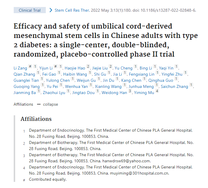 2022年5月,《Stem Cells Research & Therapy》期刊上公布了一項單中心、隨機、雙盲對照間充質(zhì)干細胞治療2型糖尿病二期臨床研究結果。該項研究由解放軍總醫院內分泌科母義明教授、生物治療中心韓衛東教授領(lǐng)銜。試驗結果表明,通過(guò)靜脈輸注給予UC-MSCs(臍帶間充質(zhì)干細胞)是一種安全有效的方法,可以減少外源性胰島素需求,緩解2型糖尿病患者的胰島素抵抗。臍帶間充質(zhì)干細胞移植是2型糖尿病的潛在治療選擇。
