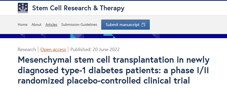 2022年6月20日,伊朗德黑蘭 ACECR 魯瓦揚干細胞生物學(xué)與技術(shù)研究所在國際期刊《Stem Cell Research and Therapy》上發(fā)布了一篇《新診斷的 1 型糖尿病患者的間充質(zhì)干細胞移植:一項 I/II 期隨機安慰劑對照臨床試驗》的研究結果。