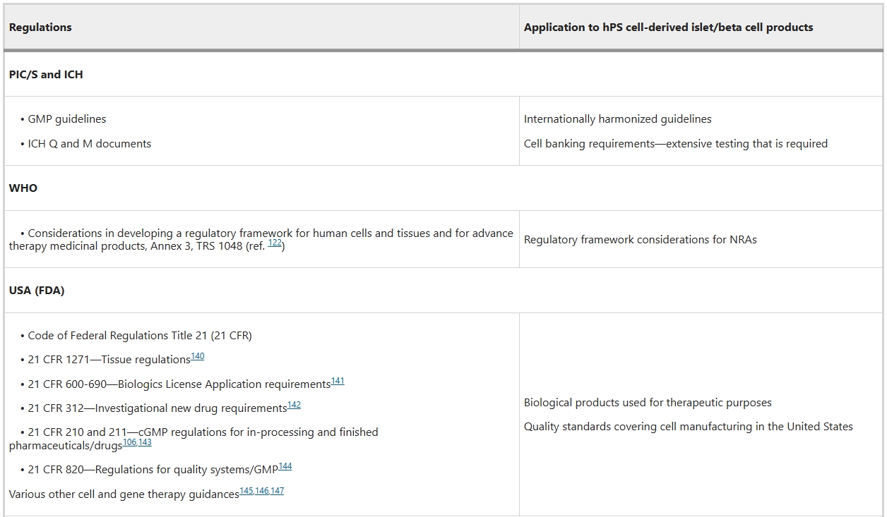 除了特定司法管轄區的規定外,藥品檢驗合作計劃 (PIC/S)、人用藥品技術(shù)要求國際協(xié)調會(huì ) (ICH) 和世界衛生組織 (WHO) 等國際組織還匯編了細胞和基因治療產(chǎn)品的協(xié)調和指導文件。不同國家監管機構 (NRA) 針對細胞治療產(chǎn)品編寫(xiě)的指南匯編已在其他地方概述。在這里,我們重點(diǎn)介紹了與生成用于臨床應用的hPS細胞衍生的胰島/β細胞相關(guān)的關(guān)鍵監管考慮因素。