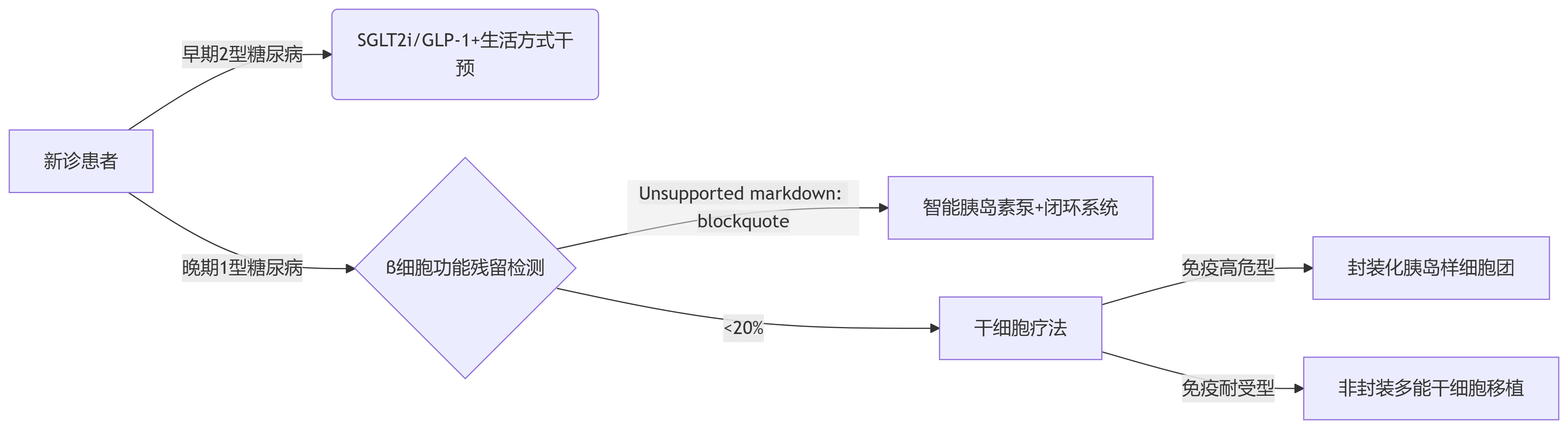 | 干細胞療法 | 分化干細胞為功能性β細胞或調節免疫 | 重建胰腺功能,實(shí)現血糖自主調節 | 臨床研究階段(II/III期) |
