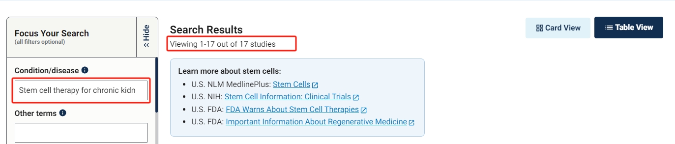 截止2023年11月,在美國國立衛生研究院的最大臨床試驗注冊庫clinicaltrials.gov網(wǎng)站上注冊的有關(guān)干細胞治療慢性腎病的臨床研究項目有17項。