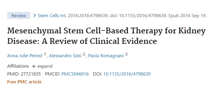 2019年,Cinzia Rota等人在《International journal of molecular sciences》雜志發(fā)表了一篇題為《 腎臟疾病的干細胞治療:進(jìn)展與挑戰 》文章,描述了全球16項關(guān)于干細胞療法在慢性腎病領(lǐng)域的臨床試驗結果,總結了當前的研究進(jìn)展和進(jìn)入臨床應用的前景。