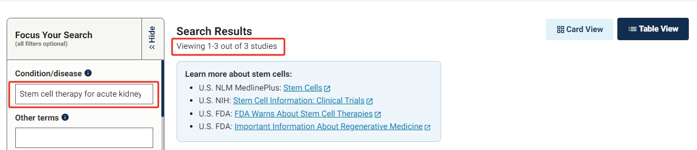 截止2023年11月,在美國國立衛生研究院的最大臨床試驗注冊庫clinicaltrials.gov網(wǎng)站上注冊的有關(guān)干細胞治療急性腎損傷的臨床研究項目有3項。