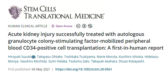 2021年,日本湘南鐮倉綜合醫院研究團隊在《干細胞轉化醫學(xué)》上發(fā)表文章,分享了利用自體干細胞移植成功治療急性腎損傷患者的經(jīng)驗。