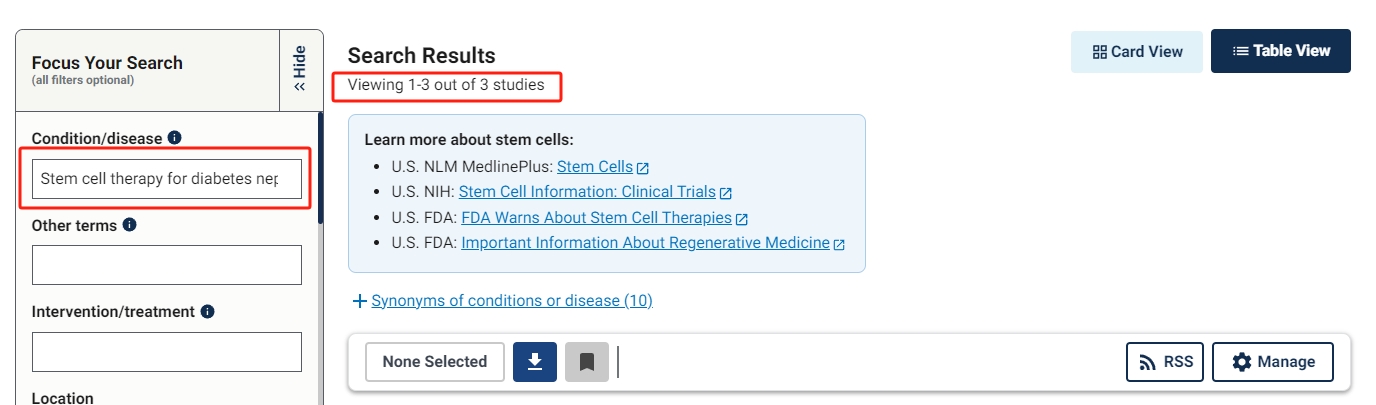 截止2023年11月,在美國國立衛生研究院的最大臨床試驗注冊庫clinicaltrials.gov網(wǎng)站上注冊的有關(guān)干細胞治療糖尿病腎病的臨床研究項目有3項。
