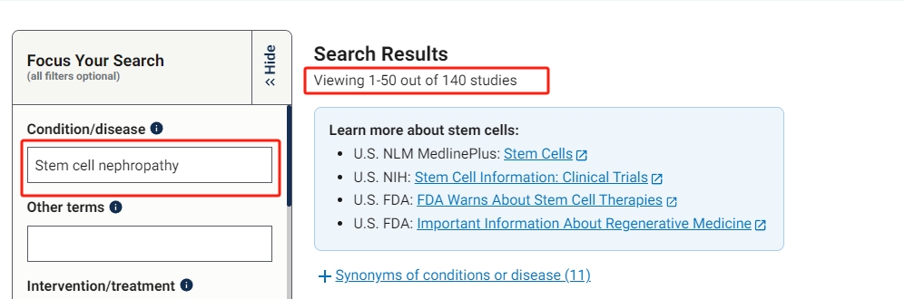截止目前為止,美國國立衛生數據庫(ClinicalTrials.gov)收錄的干細胞治療腎病的臨床試驗有140項。