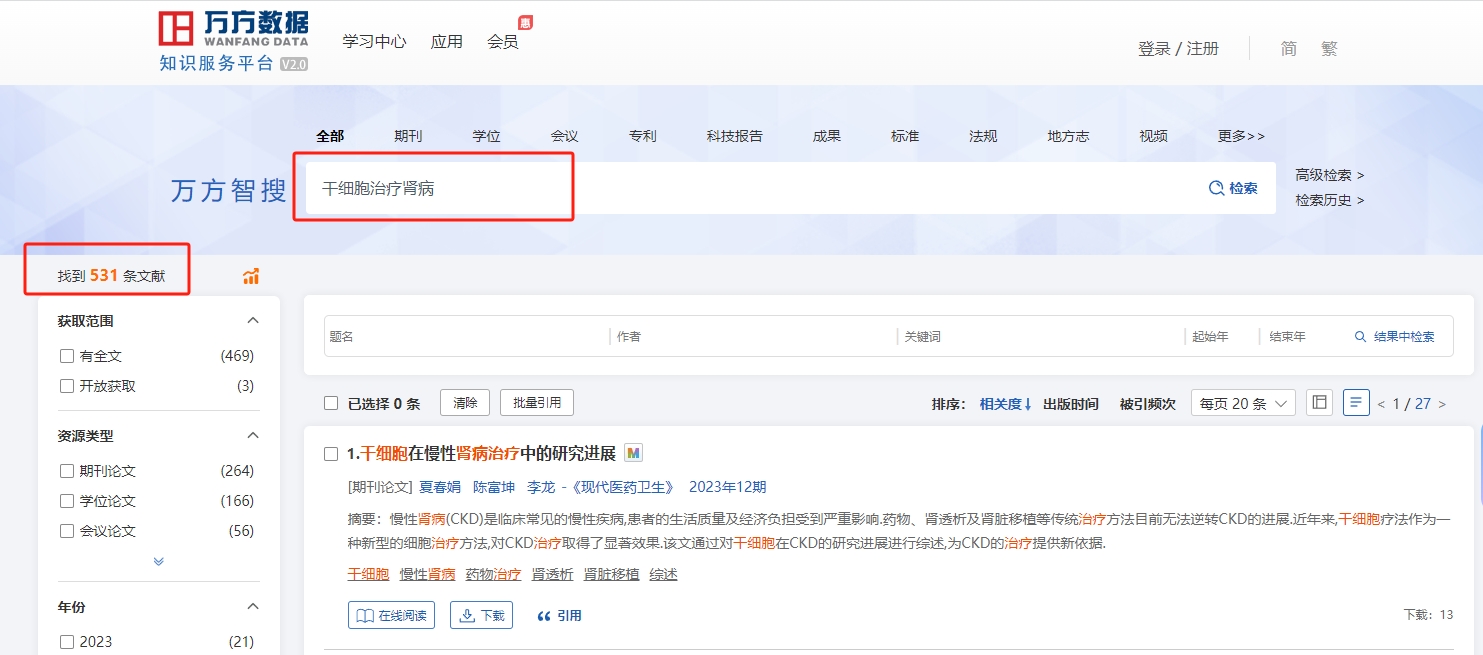 同一時(shí)間段,我們在中國萬(wàn)方數據知識平臺運用關(guān)鍵詞“干細胞治療腎病”搜索相關(guān)干細胞治療腎病的文章,發(fā)現干細胞治療腎病的論文多達531條。