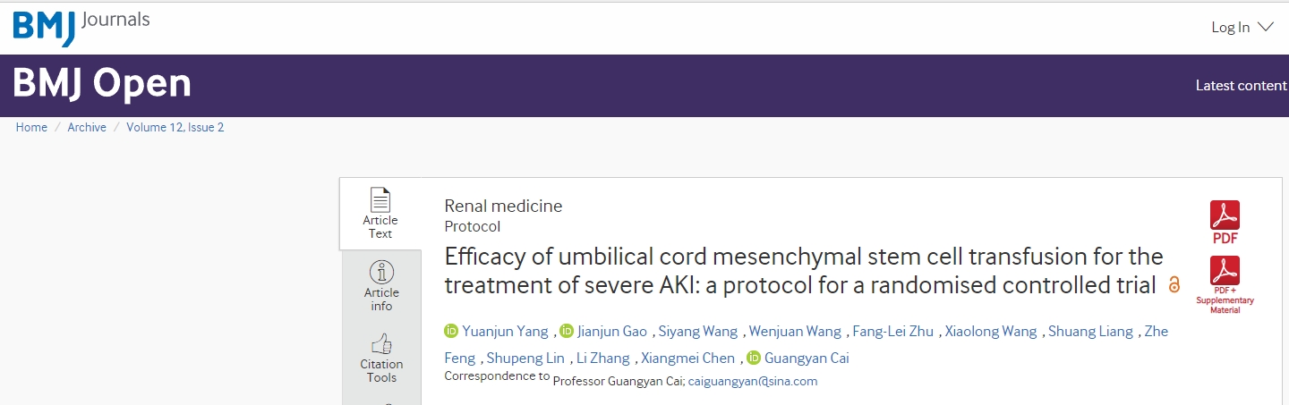 最近兩年,期刊雜志《BMJ》發(fā)表了一篇“臍帶間充質(zhì)干細胞輸注治療嚴重急性腎損傷的療效:一項隨機對照試驗方案”的文章,本試驗研究了MSC是否可以改善嚴重AKI患者的腎臟恢復和死亡率。