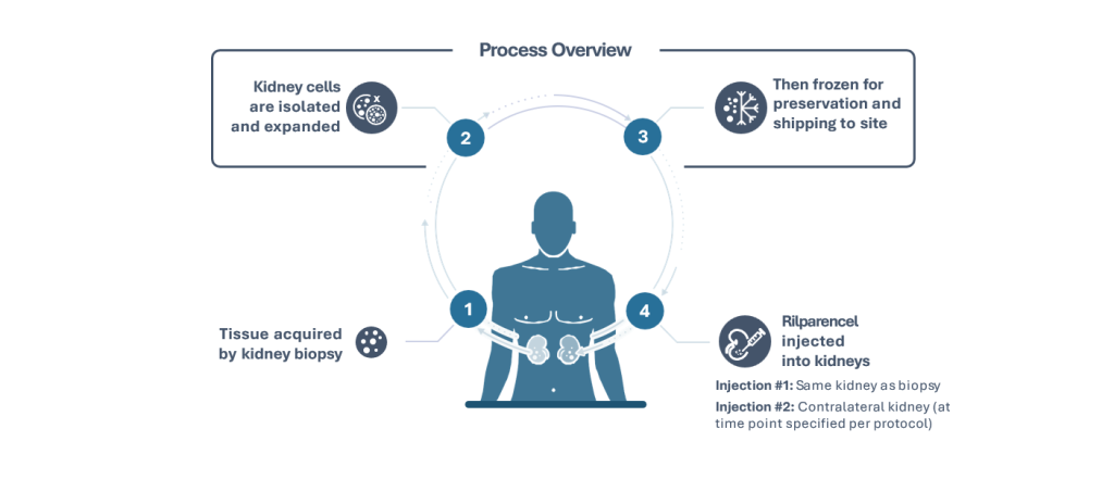 Rilparencel是一種經(jīng)皮微創(chuàng )注射的自體細胞療法產(chǎn)品,由患者自身的腎臟細胞在體外擴增后制備而成。正是由于其自體來(lái)源的特性,患者接受治療后無(wú)需終生服用免疫抑制劑來(lái)防止排斥反應。