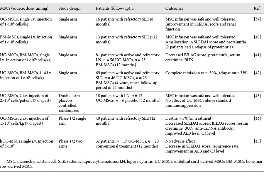 間充質(zhì)干細胞治療的第一個(gè)I期試驗由Lazarus等人進(jìn)行證明了在15名患者志愿者中進(jìn)行離體培養擴增和靜脈輸注自體BM-MSC的安全性。從那時(shí)起,作為一種預防或治療造血干細胞移植后移植物抗宿主病的新工具,MSC 治療免疫疾病的報道不斷被報道?;趶腗SCs治療狼瘡易發(fā)小鼠的那些臨床前研究中收集的令人鼓舞的數據結果,MSC群體已經(jīng)在LN患者的臨床試驗中進(jìn)行了測試(表1)。