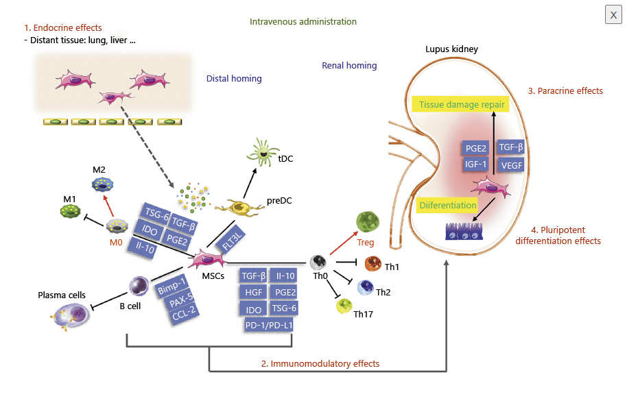盡管間充質(zhì)干細胞在狼瘡腎炎治療中的治療效果有體外和體內證據,但仍存在關(guān)于最佳劑量、給藥途徑和輸注后細胞命運的主要問(wèn)題。因此,探索間充質(zhì)干細胞發(fā)揮其免疫調節和修復作用的機制至關(guān)重要。到目前為止,尚未發(fā)現統一的機制,但可用數據揭示了間充質(zhì)干細胞有益作用的多種工作模型。根據目前的理解,我們總結了圖2中的關(guān)鍵機制。