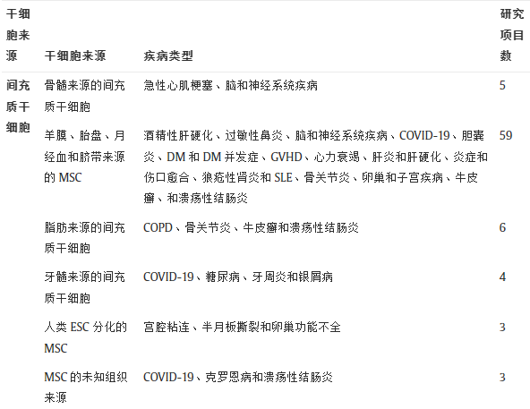 截至2021年10月,約130家三甲醫院獲國家衛健委和國家藥監局授權開(kāi)展干細胞臨床研究。本節簡(jiǎn)要概述了六年的搜索,迄今為止已確定了總共100個(gè)臨床研究項目。這些項目在2015年法規實(shí)施后已獲得衛生和藥品主管部門(mén)的批準。這些臨床研究項目的總結如表1所示。