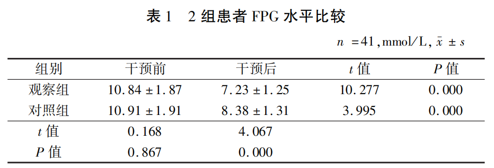 2組患者FPG水平比較:干預前,2組FPG水平差異無(wú)統計學(xué)意義(P>0. 05);干預后,2組FPG水平明顯降低(P<0.05),且與對照組比較,觀(guān)察組降低更明顯(P<0.05)。見(jiàn)表1。