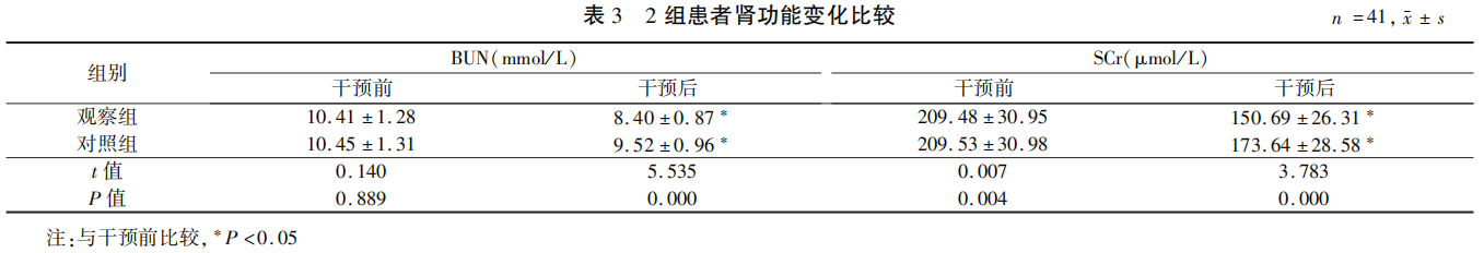 2組患者腎功能比較:治療前,2組患者的BUN、SCr水平差異無(wú)統計學(xué)意義(P>0.05);治療后,2組BUN、SCr水平明顯降低(P<0.05),與對照組比較,觀(guān)察組的BUN、SCr降低更明顯,差異有統計學(xué)意義(P<0.05)。見(jiàn)表3。
