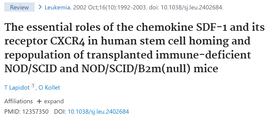 [1] Lapidot, T., & Kollet, O. (2002). Leukemia, 16(10), 1992-2003.