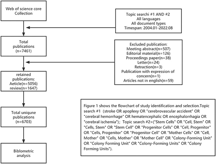 方法:我們使用Web of Science核心合集檢索2004年至2022年間發(fā)表的有關(guān)中風(fēng)干細胞的相關(guān)文章。使用CiteSpace、VOSviewer和R軟件包“bibliometrix”進(jìn)行分析,以確定出版物產(chǎn)出、國家/地區、機構、作者/共同被引作者、期刊/共同被引期刊、共同被引參考文獻和關(guān)鍵詞。最終,6,703條記錄被納入分析。具體文獻篩選流程見(jiàn)圖1。