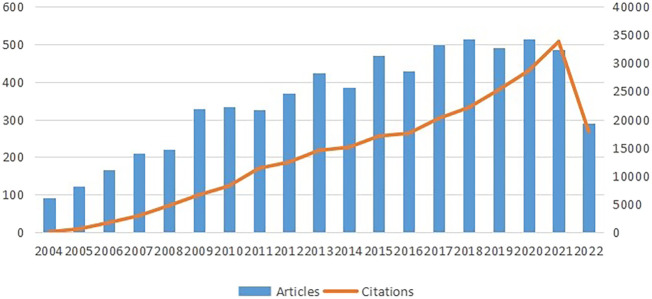 可以看出圖2,直方圖和曲線(xiàn)展示了兩個(gè)趨勢:每年發(fā)表的論文總數和引用次數。這兩種趨勢隨著(zhù)時(shí)間的推移而增長(cháng),說(shuō)明了該領(lǐng)域研究的發(fā)展方向。2004年至2021年間,引用次數顯著(zhù)且迅速增加,表明干細胞在中風(fēng)中的研究引起了人們的興趣。2004年至2007年,文獻數量快速增長(cháng),2009年更是大幅增長(cháng)。不過(guò),2010年至2017年的文章數量保持相對穩定。2020年是近年來(lái)發(fā)表數量最多的一年,峰值為515篇。雖然2022年的數據尚未完成,但預計將呈現出與上年相比,呈溫和趨勢。