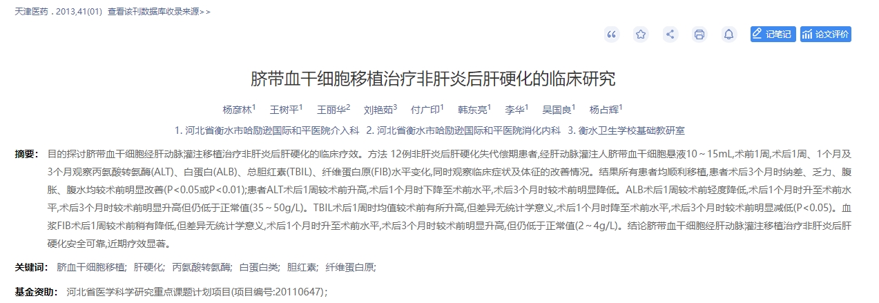 2013年,天津醫藥期刊發(fā)表了一篇臍帶血干細胞移植治療非肝炎后肝硬化的臨床研究[1]。