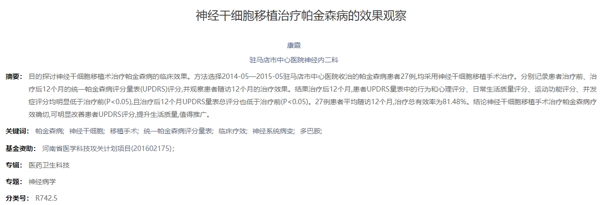 同年,駐馬店市中心醫院神經(jīng)內二科在中國知網(wǎng)發(fā)表了“神經(jīng)干細胞移植治療帕金森病的效果觀(guān)察”的文章[1]。