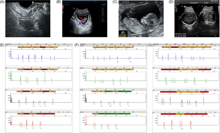 收集了15名接受取卵的患者的基本特征,包括取卵周期、胚胎移植和妊娠次數。一般來(lái)說(shuō),四個(gè)胎兒沒(méi)有出生缺陷,三個(gè)胚胎來(lái)自ICSI的受精類(lèi)型,而最后一個(gè)是自然受孕的。1例術(shù)中超聲掃描顯示,在經(jīng)陰道超聲(TVUS)引導下,卵巢未見(jiàn)間質(zhì)增生或其他異常卵巢結構(圖2A)。這名婦女在體外受精后成功懷孕,并在第8周進(jìn)行了基本產(chǎn)前程序的超聲掃描(圖2B),第13周(圖2C) 和第32周 (圖二維) 顯示正常的胎兒發(fā)育。微衛星位點(diǎn)分析顯示,胎兒(圖2F)與母親有遺傳關(guān)系(圖2E) 供體UCMSC以外的其他人(圖2G)。