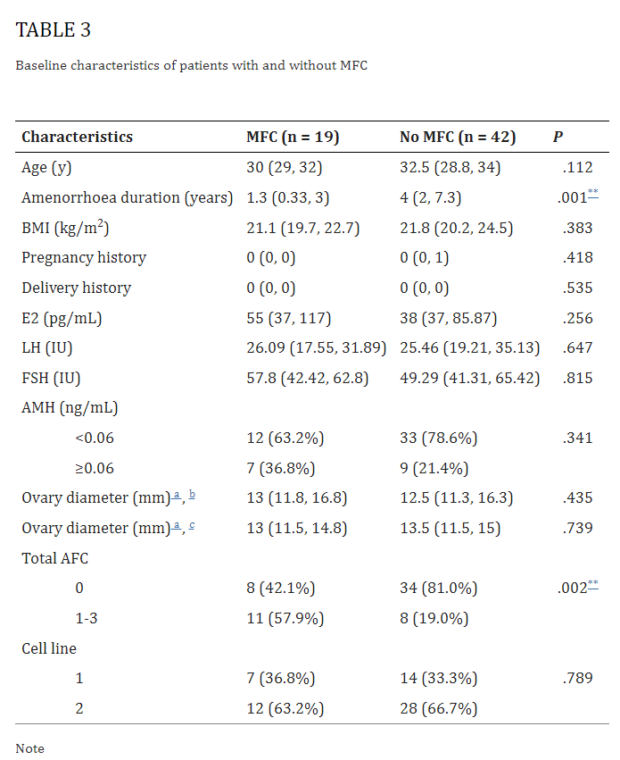 為了確認治療效果與治療之前之間的關(guān)系,我們比較了19名在UCMSC注射后獲得成熟卵泡的患者和其他 42名未發(fā)育成熟卵泡的患者的基本臨床特征。MFC患者的中位年齡為30歲,閉經(jīng)持續時(shí)間為1.3年。這些MFC患者的E2血激素水平有高于無(wú)MFC組的趨勢,兩組之間LH和FSH水平?jīng)]有差異。作為卵巢儲備的有效指標,還測試了AMH水平。總體而言,MFC組36.8%的AMH水平≥0.06ng/mL,而無(wú)MFC組的比例為 21.4%。
