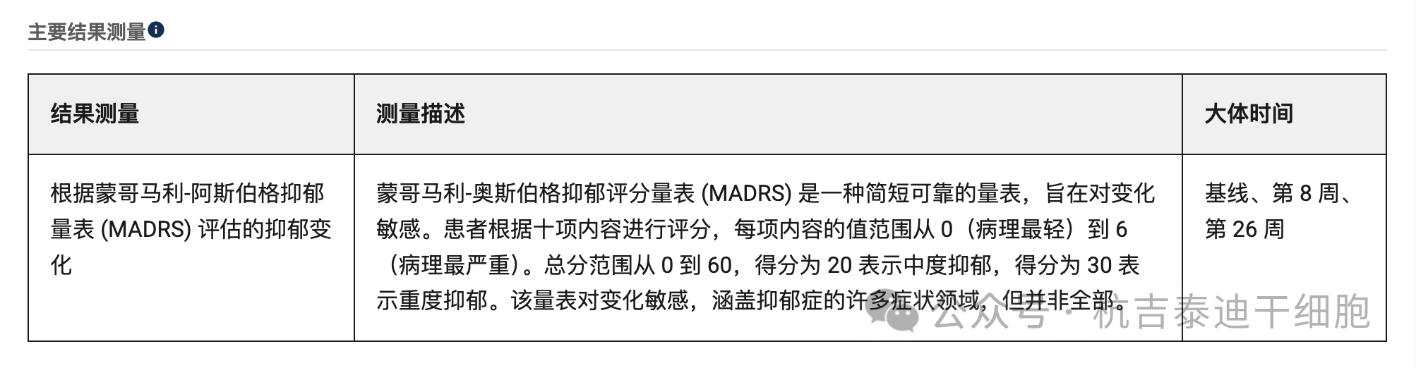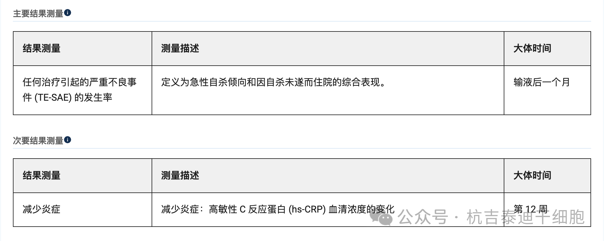 正式名稱(chēng):一項I期前瞻性、隨機、雙盲、安慰劑對照試驗,旨在評估同種異體人類(lèi)間充質(zhì)干細胞輸注與安慰劑對難治性抑郁癥患者的安全性和潛在療效。