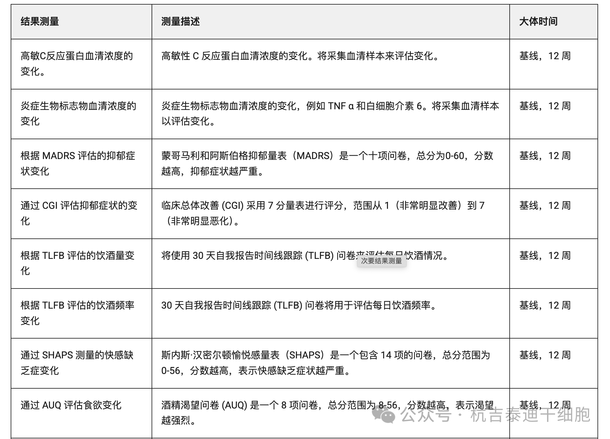 臨床試驗二:同種異體人類(lèi)間充質(zhì)干細胞輸注與安慰劑在酒精使用障礙和重度抑郁癥中的比較