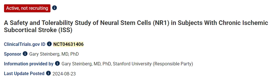 首次使用胚胎源性神經(jīng)干細胞 (NR1) 進(jìn)行腦內移植治療慢性缺血性中風(fēng)的 1/2a 期人體研究 (NCT04631406):12 個(gè)月結果