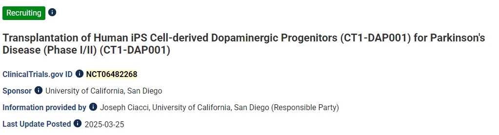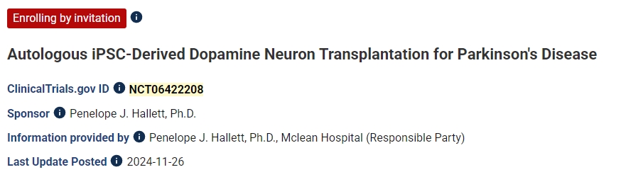 該項1期臨床試驗 (NCT06422208) 針對6名接受自體iPSC衍生多巴胺神經(jīng)元移植治療帕金森病的患者,該試驗基于Penelope J. Hallett博士的工作。