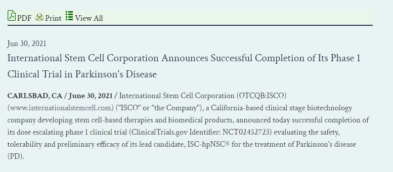 2021年6月30日,一家總部位于加利福尼亞州的臨床階段生物技術(shù)公司,致力于開(kāi)發(fā)基于干細胞的療法和生物醫學(xué)產(chǎn)品,宣布成功完成其劑量遞增1期臨床試驗(ClinicalTrials.gov標識符:NCT02452723),試驗對象為12名患者。評估其主要候選藥物ISC-hpNSC?用于治療帕金森病 (PD) 的安全性、耐受性和初步療效。