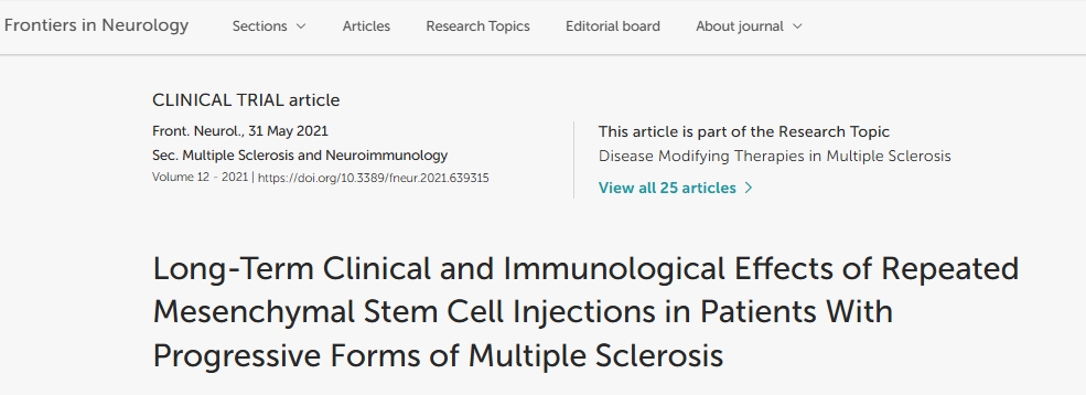 Petrou Panayiota , Kassis Ibrahim , Ginzberg Ariel , Halimi Michel , Yaghmour Nour , Abramsky Oded , Karussis Dimitrios. Long-Term Clinical and Immunological Effects of Repeated Mesenchymal Stem Cell Injections in Patients With Progressive Forms of Multiple Sclerosis. Frontiers in Neurology, Volume 12, 2021. https://www.frontiersin.org/journals/neurology/articles/10.3389/fneur.2021.639315