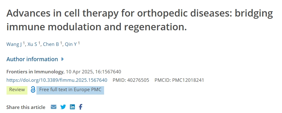 [1]Wang J, Xu S, Chen B, Qin Y. Advances in cell therapy for orthopedic diseases: bridging immune modulation and regeneration. Frontiers in Immunology. 2025 ;16:1567640. DOI: 10.3389/fimmu.2025.1567640. PMID: 40276505; PMCID: PMC12018241.