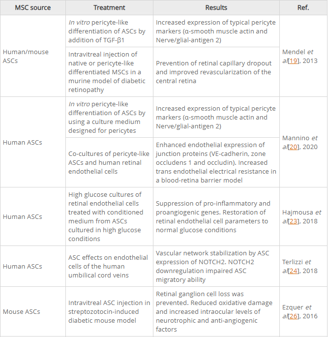 由于這些原因,許多研究都專(zhuān)注于開(kāi)發(fā)可以在不可逆轉的損害發(fā)生之前減輕或阻止疾病進(jìn)展的療法。間充質(zhì)干細胞的治療幾項體外或動(dòng)物模型研究表明,基于間充質(zhì)干細胞的策略可能是糖尿病視網(wǎng)膜病變治療的寶貴工具。表1總結了主要結果。