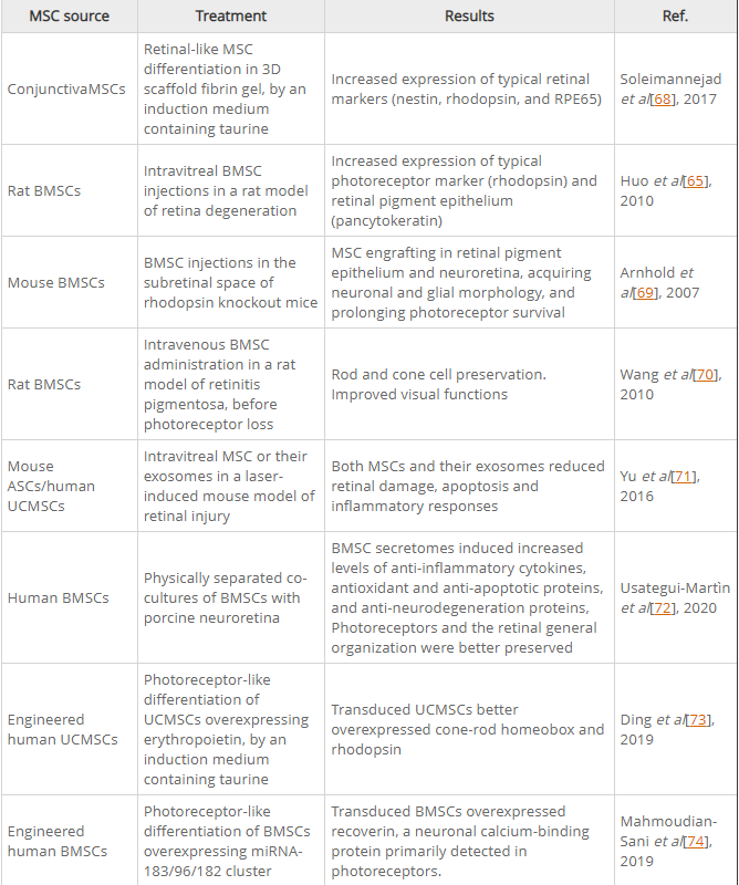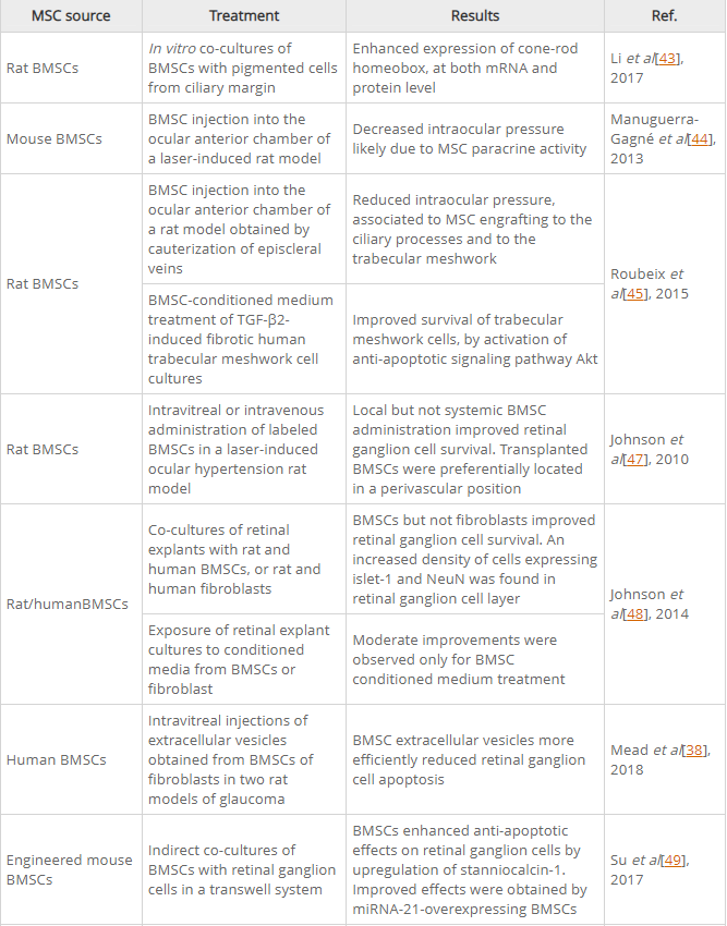 在基于MSC的治療后獲得的結果總結在表2中。它們中的大多數表明RGC存活率提高、功能性RGC樣細胞的產(chǎn)生以及成熟RGC中常駐視網(wǎng)膜干細胞的擴增和分化。盡管玻璃體內給藥通常會(huì )產(chǎn)生少量的MSC植入和視網(wǎng)膜分化,但有益效果也歸因于MSC釋放的神經(jīng)營(yíng)養因子。